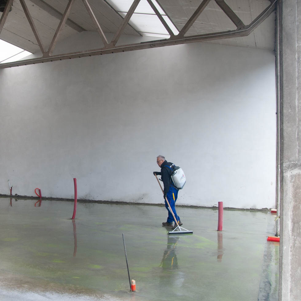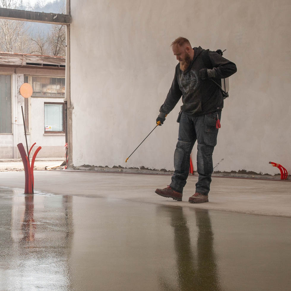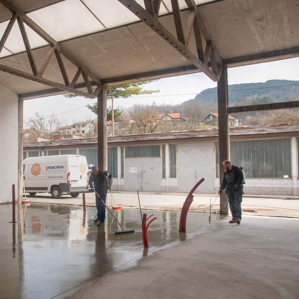 Na stari betonski talni plošči smo morali najprej površino namočiti oz. razpršiti vodo po celotnem predvidenem delu. Potem, ko smo razpršili zaščito, smo po 30-40 minutah odvečni material, ki se je nabral v neravnih delih odstranili z gradbeno metlo. Na površinah, ki so bile zelo porozne smo dodatno nanesli zaščito, s tem je bila dosežena največja možna zaščita. Ko je bila površina po 30-40 minutah spolzka, smo jo sprali s čisto vodo iz jo z otiralnikom popolnoma osušili in s tem odstranili vse ostanke tekočine.