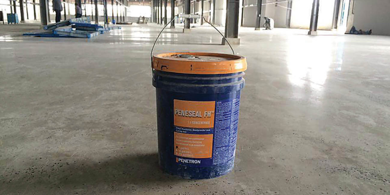Na novem delu betonske plošče smo takoj po zaključku betoniranja, ko je bila površina dovolj trdna, da smo se lahko hodi po njej, po celotnem delu razpršili tekočino ter jo po cca 30. minutah z mehko ščetinasto metlo vtirali v beton. Ko je tekočina postala spolzka, smo jo ponovno orosili z vodo. S tem je material na površini obdržal največjo možnost prodiranja v beton. Ko je tekočina še enkrat postala spolzka, smo to površino po 30 minutah sprali z vodo, saj se PENESEAL ™ FH prej na podlagi ne sme posušiti na površini.
