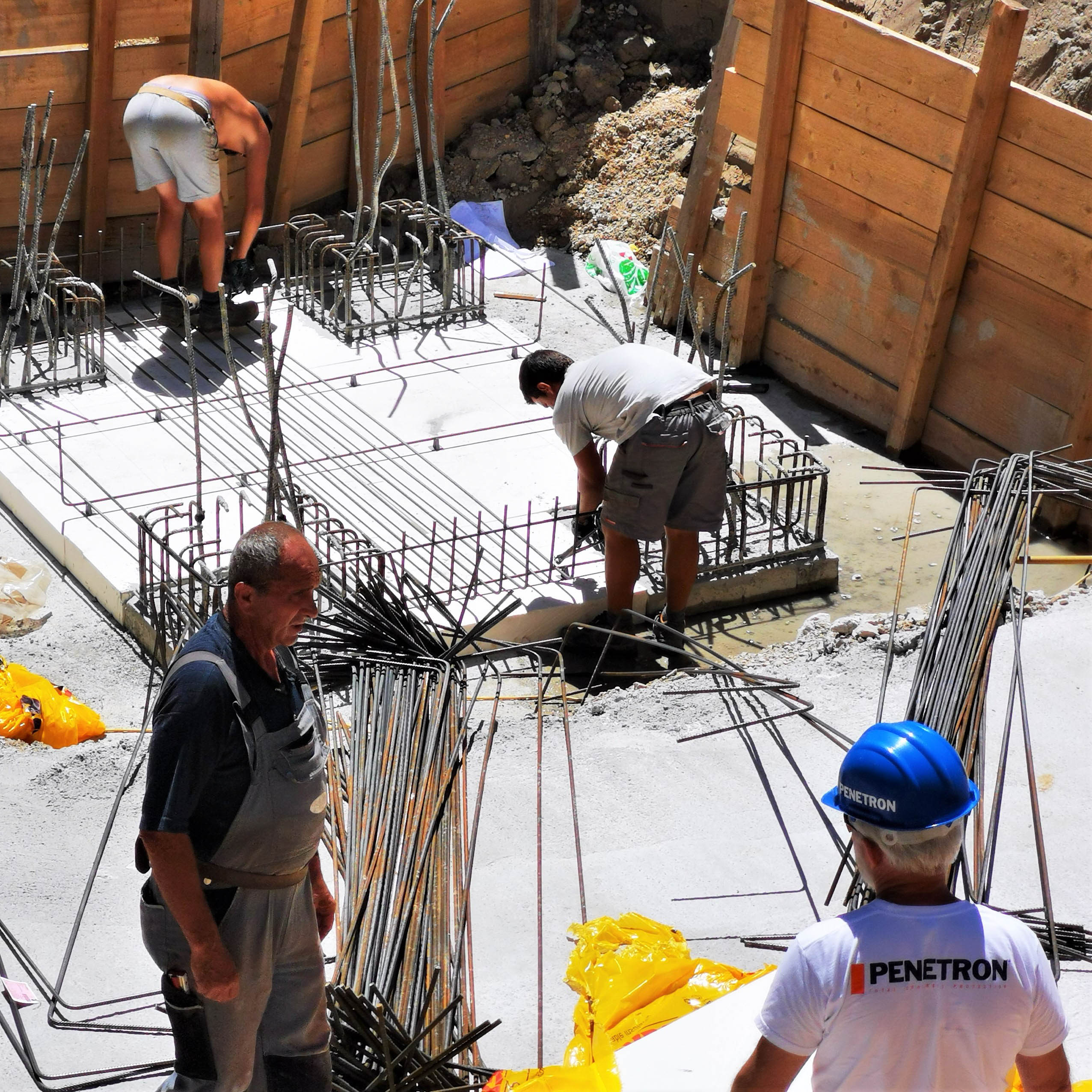 Temeljna plošča se po projektu zavaruje s kristalizacijsko tehnologijo PENETRON. Vsi betonski stiki za nadaljevanje betoniranja bodo vključevali posebne PENETRONOVE - PENEBAR nabrekajoče trakove, ki s pravilno vgraditvijo nudijo 100% zaščito pred napadi vode in drugih škodljivih snovi. Trakovi poleg preprečitve vstopa vode med betonskimi stiki zagotovijo, da v procesu zorenja in tudi kasneje, nastajajoči netopni kristali, neprepustno zaprejo stike in povežejo beton v homogeno betonsko celoto.
